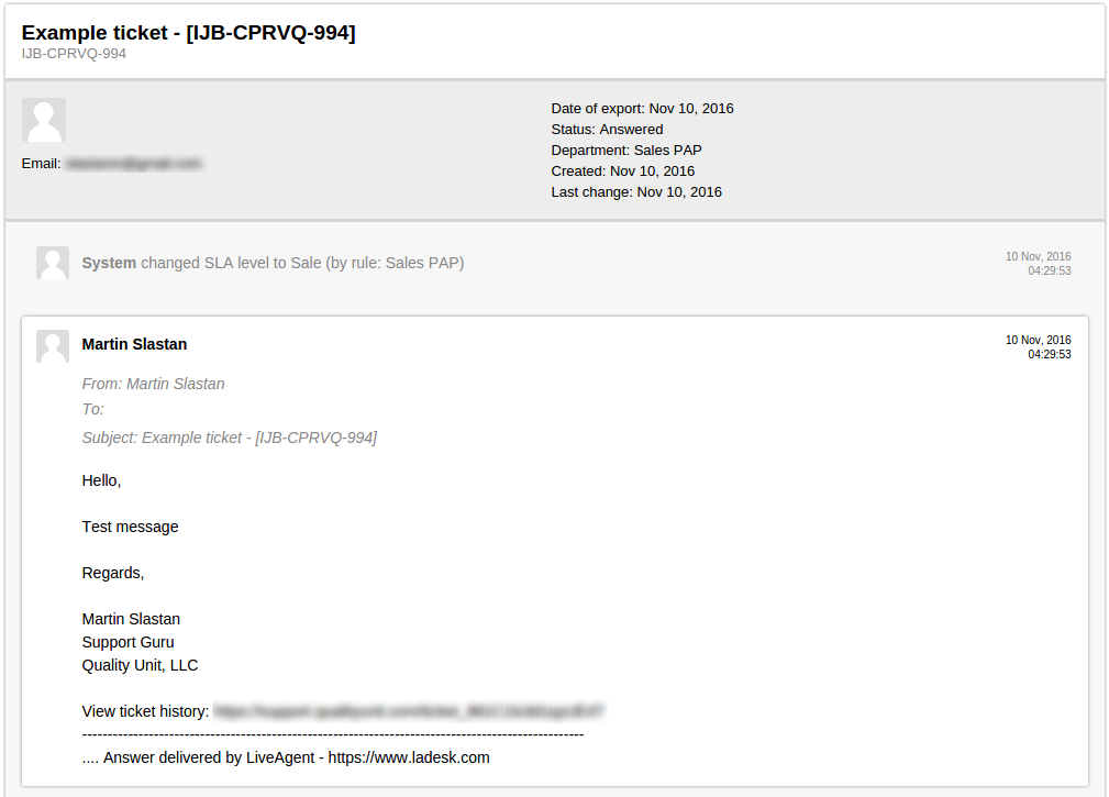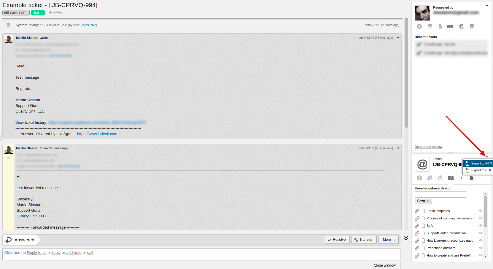 Od verze LiveAgent 4.42.1.2 je možné snadno exportovat celý tiket do souboru PDF nebo HTML. Tato funkce umožňuje ukládat tickety zákazníků na externí úložiště, nebo je tisknout.